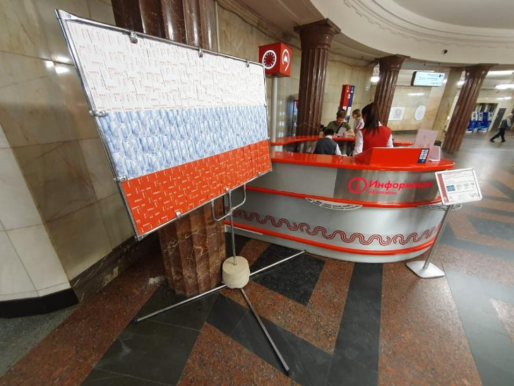 Флаг высотой 2 метра и шириной 1,5 метра пассажиры метрополитена смогут увидеть в аванзале станции «Курская». Триколор состоит из 750 тысяч использованных проездных «Единый» белого, синего и красного цвета.