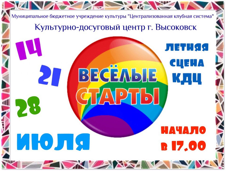 Спортивная программа «Веселые старты» состоится на летней сцене КДЦ г. Высоковск 14, 21 и 28 июля 2019 года. Начало в 17:00.