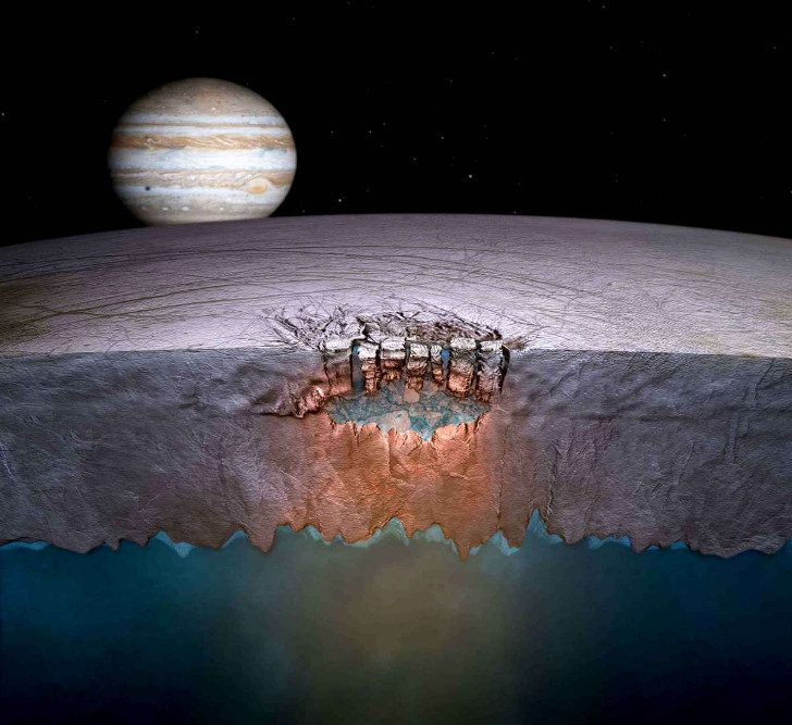 Европа — одна из самых больших лун в Солнечной системе, она является одним из спутников Юпитера. После того как к Европе приблизились аппараты «Voyager» и «Galileo», ученые пришли к выводу что под толстым слоем льда, который образует корку на поверхности планеты, есть жидкая вода. Новое предположение специалистов НАСА поддерживает теорию существования жизни на спутнике в его подледном океане.