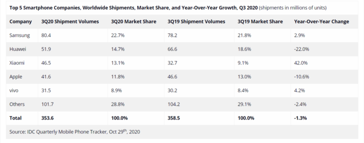В третьем квартале 2020 года Samsung вернула себе лидирующую позицию с долей рынка 22,7%. За отчётный период южнокорейский производитель отгрузил 80,4 млн смартфонов, что на 2,9% больше, чем годом ранее. В Индии, крупнейшем рынке для Samsung и составляющем 15% от общего объёма, южнокорейский бренд значительно улучшил свои позиции, с ростом почти на 40% в годовом исчислении.