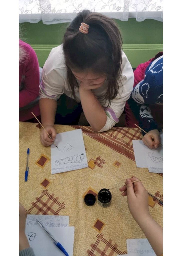 Многие девочки первый раз взяли в руки настоящую перьевую ручку. Написание поздравления чернилами оказалось делом нелегким, но увлекательным.