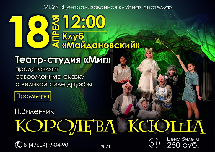 18 апреля 2021 года в 12:00 клуб «Майдановский» приглашает на премьеру современной сказки о великой силе дружбы «Королева Ксюша» (Н.Виленик) Театра-студии «Миг».
