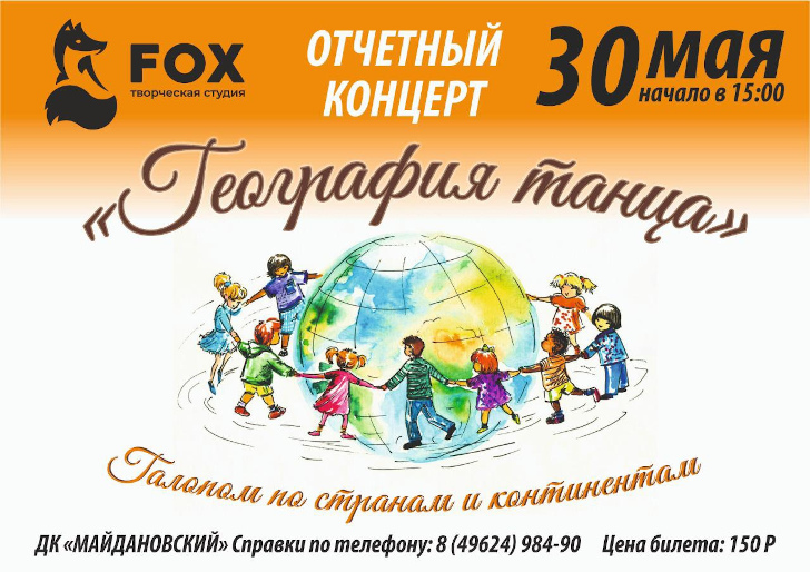 Дорогие друзья! Приглашаем вас 30 мая в 15.00 в клуб «Майдановский» на отчетный концерт творческой студии «Fox» «География танца. Галопом по странам и континентам».
