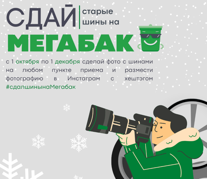Правила акции простые: участникам необходимо привезти старые шины на «Мегабак» или пункты переработчиков «Орис Пром», «Чеховский Регенеративный Завод», «Дмитровский РТИ», сделать фото с шинами на любом из указанных в списке адресов пунктов приема и разместить фотографию в Инстаграм с хештэгом #сдалшинынаМегабак, далее поместить шины в специально предназначенные для б/у покрышек контейнерные емкости.