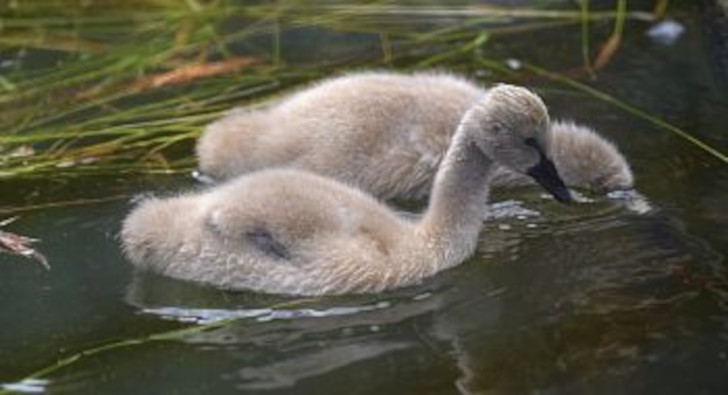 Двое птенцов появились на свет в конце июня, и ещё один птенец у другой самочки – в начале июля. Первую неделю жизни они привели на спинах своих родителей. Маленькие лебедята вначале покрыты очень тонким темно-серым пухом, который быстро промокает. Поэтому после появления на свет они забираются на родителей. Сейчас они уже плавают самостоятельно, но предпочитают держаться неподалёку от родителей.