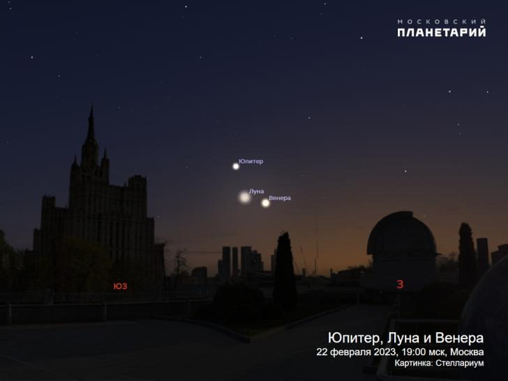 22 февраля 2023 года тонкий серп растущей Луны окажется между двумя яркими планетами. Эту красивую картину можно будет наблюдать над западным горизонтом при ясной погоде около 19:00 мск в течение двух часов (с 18:30 до 20:30 мск), сразу после захода Солнца. Три самых ярких объекта на ночном небе окажутся совсем близко, в круге диаметром 7-8 градусов. Такие сближения небесных тел называются соединениями.