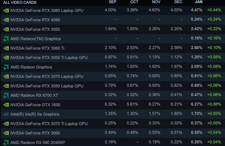 Семейство Ampere: RTX 3050, 3060 Ti и 3090 также продемонстрировали хороший прирост пользователей в январе этого года. Лидером по популярности стала Radeon RX 6700 XT с ростом на 0,06%, хотя большинство современных видеокарт AMD стойко находятся внизу таблицы.