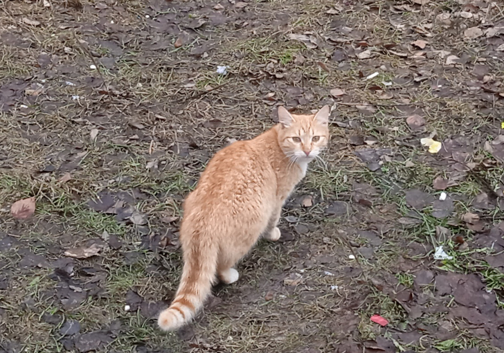 Два бело-рыжих кота, играли друг с другом на детской площадке. То забегут на карусель, то горка их привлекла, потом их увлек и мой велосипед.