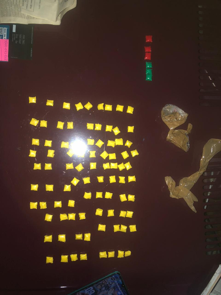 В ходе досмотра у правонарушителя были обнаружены и изъяты 87 свертков желтого цвета, 3 зеленого цвета и 3 красного цвета с порошкообразным веществом.