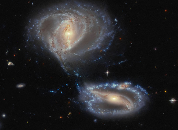 Все три галактики расположены довольно близко друг к другу примерно в 500 миллионах световых лет от Земли в направлении созвездия Тукан, и, как видно на снимке, они гравитационно взаимодействуют друг с другом. Фактически, галактики находятся на пути к тому, чтобы в конечном итоге стать единым целым.