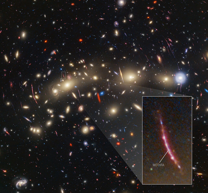 Используя космический телескоп «James Webb», астрономы получили снимок скопления галактик MACS0416, удаленного от Земли на 4,3 миллиарда световых лет. Анализируя данные, ученые, помимо россыпи галактик и сверхновых, смогли идентифицировать звезду, свет от которой благодаря эффекту гравитационного линзирования был усилен примерно в 4 тысяч раз и стал доступен для наблюдения.