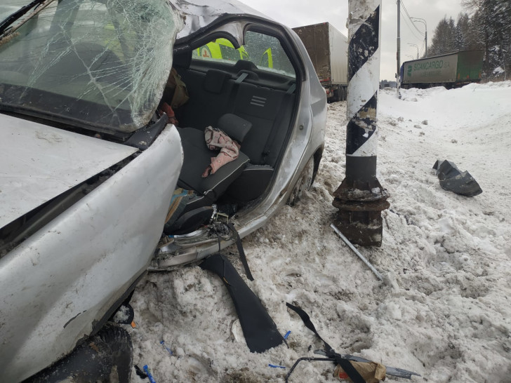 Заместитель начальника ПСЧ-313 Юрий Терентьев сообщил, что утром на федеральной автодороге столкнулись следовавшие в попутном направлении грузовик Volvo и легковая машина Renault Logan, которая от сильного удара съехала с трассы и боком влетела в опору освещения. В результате аварии водитель иномарки оказался зажат в смятом салоне.