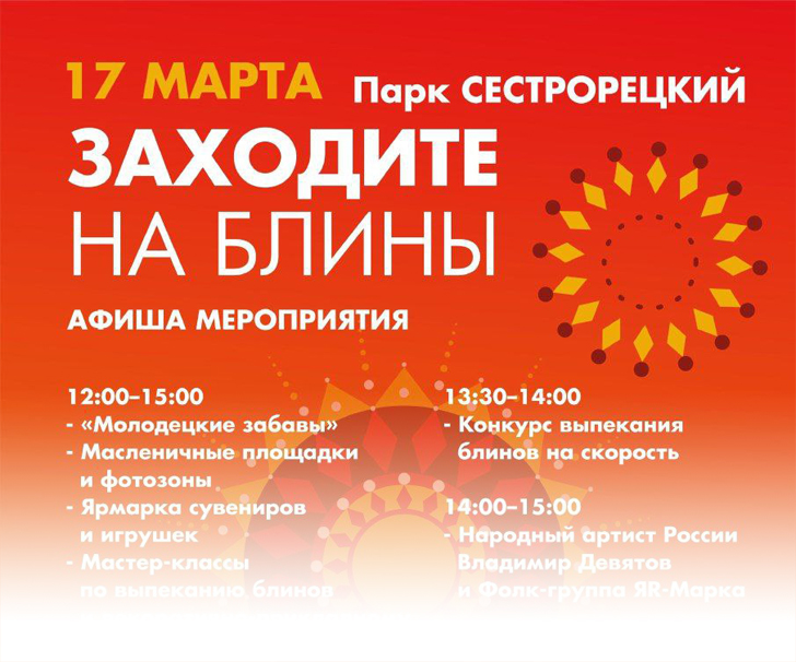 Вторая, послеобеденная часть праздника, пройдёт на большой парковке Сестрорецкого парка. В 16:30 там начнёт своё выступление фольклорный ансамбль «Поляне», а в 17:00 праздник завершится сжиганием масленичного чучела.
