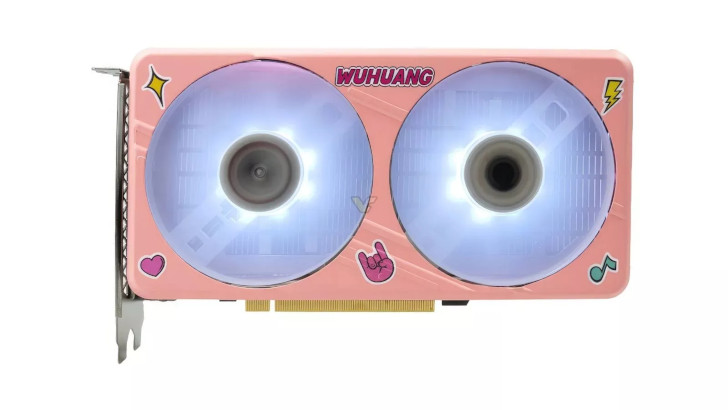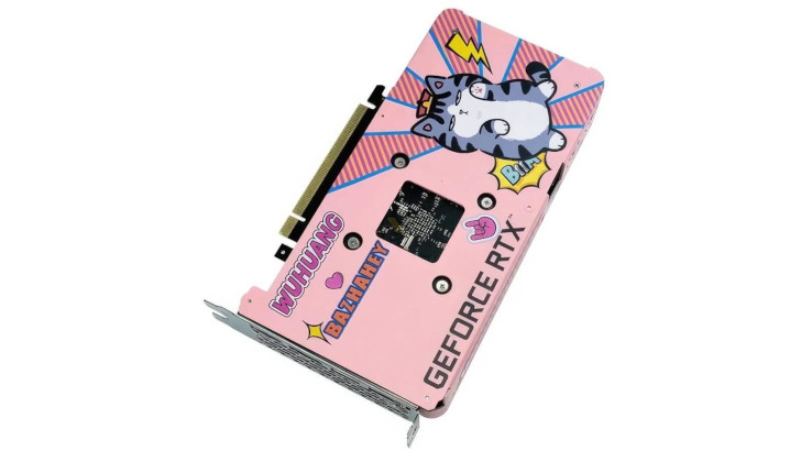 Розовая GeForce RTX 4060 очаровательно оформлена в кошачьей тематике. В центре каждого вентилятора размещены изображения Ухуан и Бачахей (дуэт кота и мопса) в солнцезащитных очках. На обратной стороне напечатаны имена мультяшных героев вместе с большим изображением Ухуана. Поставляется карта в розовой упаковке, из которой выглядывает кот.