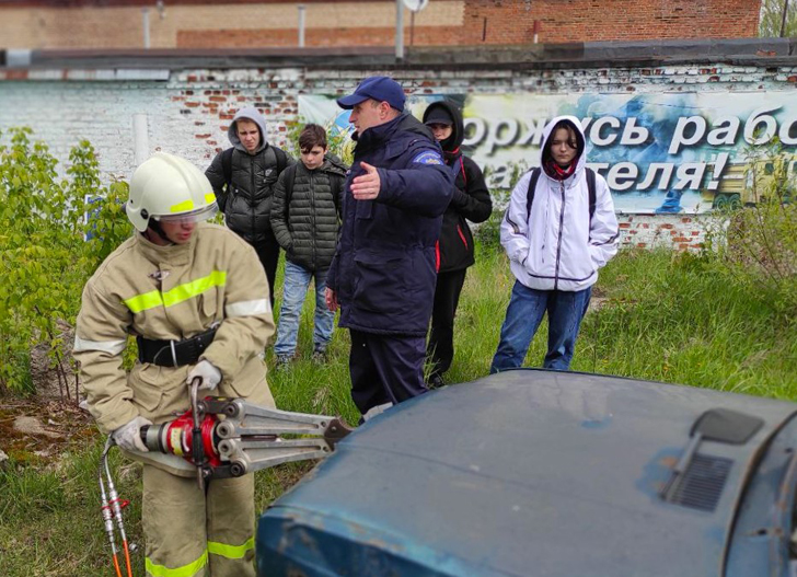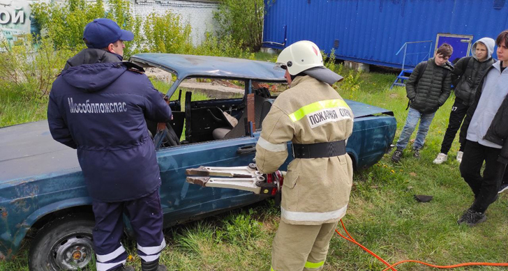 После чего ребята, облачившись в каски и боевую одежду пожарных, смогли самостоятельно применить гидравлические ножницы и вскрыть капот учебного автомобиля.