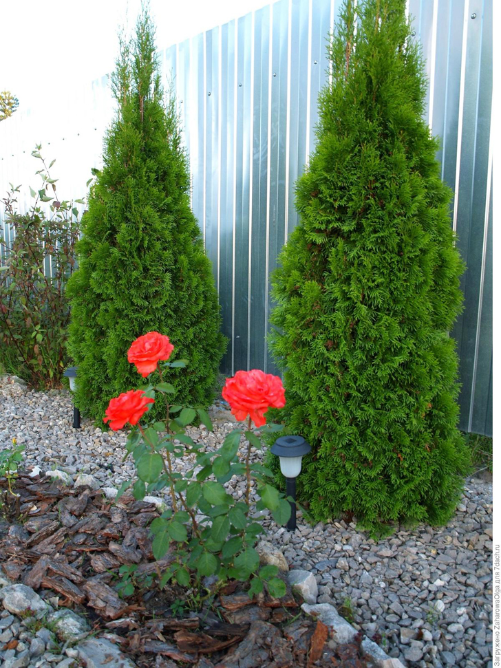 Ну и конечно же, я фанат цветов и декоративных кустарников. Они занимают большую часть участка. Вот туи Смарагд и роза.