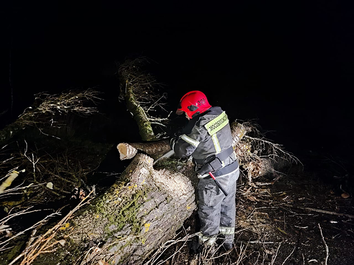 Начальник части Олег Рябцев рассказал, что в единую службу экстренных вызовов «Система-112» около часа ночи поступило сообщение о том, что на участке автодороги вблизи деревни Утицы сильный ветер повалил высокое дерево, которое перекрыло дорогу.