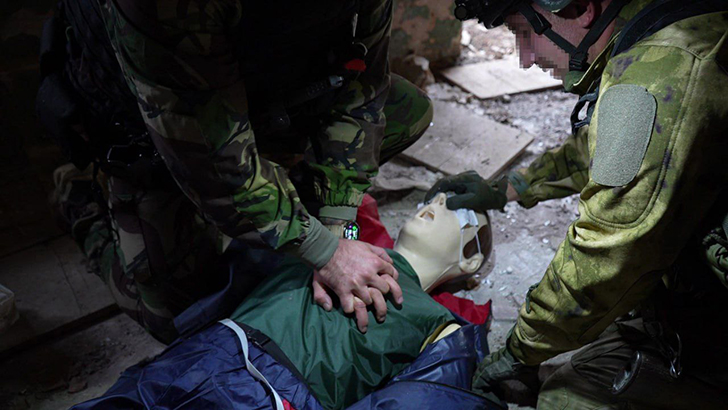 На завершающем этапе сборов сотрудники Росгвардии отработали алгоритм действий в полевых условиях: эвакуация раненного из задымленного здания, оказание доврачебный помощи и проведение сердечно-легочной реанимации в экстремальных ситуациях, передача пострадавшего передовой медицинской группе.