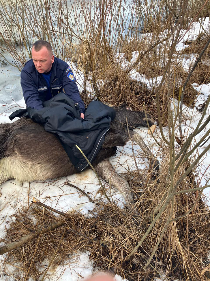 «По указанному адресу оперативно прибыли работники противопожарно-спасательной службы. Спасатели подобрались к животному, осторожно накинули трос на шею парнокопытного и вместе с местными жителями вытянули его на берег. На суше выяснилось, что лосиха беременная. Животное выбилось из сил и не могло подняться на ноги. Специалисты укутали замерзшую лосиху в термоодеяло и растерли её тело, чтобы улучшить кровообращение. Убедившись, что будущая мамочка может передвигаться самостоятельно, животное отпустили в лес», — пояснил Сергей Бардышев.