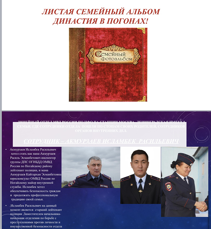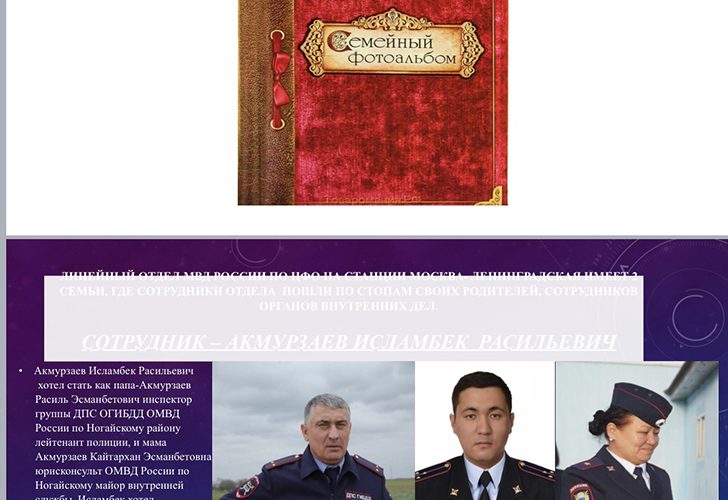 Вместе с праздником проходит акция «Листая семейный альбом», в которой участвуют два сотрудника Линейного отдела – Акмурзаев Исламбек Расильевич старший лейтенант полиции, заместитель начальника – начальник отделения по борьбе с преступлениями против личности и имущественной безопасности отдела уголовного розыска и Терентьева Елена Сергеевна старший лейтенант полиции специалист НПП ОРЛС, кто пошёл по стопам своих родителей и продолжил династию сотрудников органов внутренних дел. Передача профессионального опыта внутри семьи облегчает профессиональное развитие и повышает мотивационное основание для дальнейшего совершенствования.