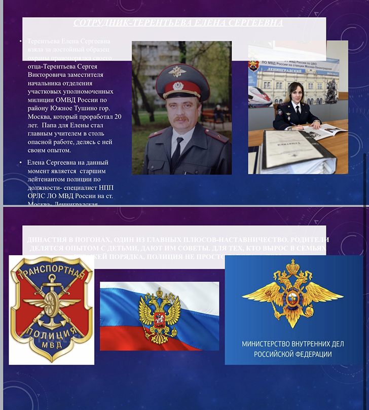 Терентьева Елена Сергеевна взяла за достойный образец охраны правопорядка своего отца-Терентьева Сергея Викторовича, заместителя начальника отделения участковых уполномоченных милиции ОМВД России по району Южное Тушино г. Москвы, который проработал в органах внутренних дел 20 лет.