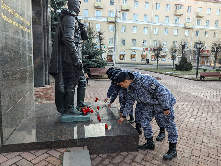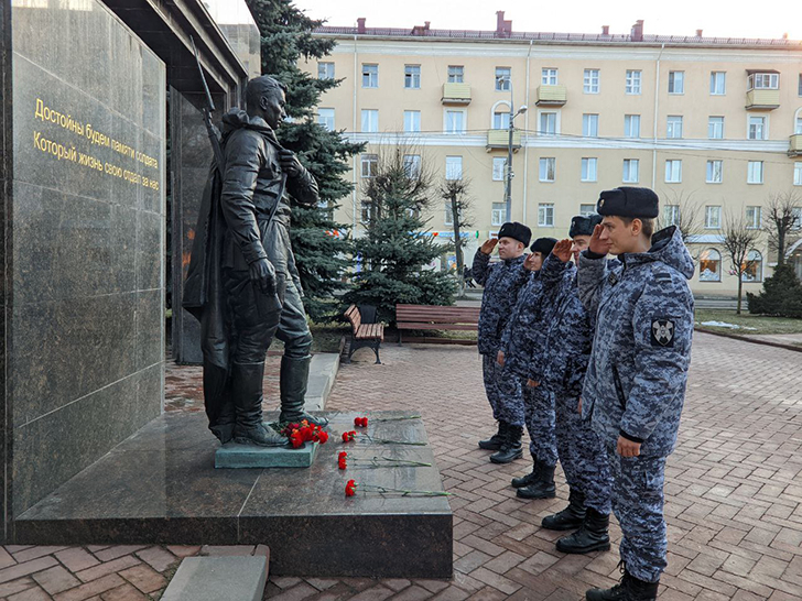 Росгвардейцы возложили алые гвоздики к мемориальному комплексу и почтили память погибших минутой молчания.