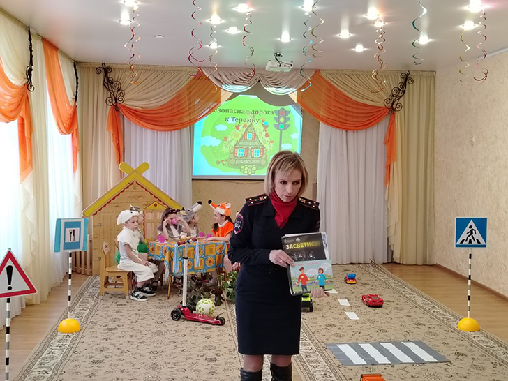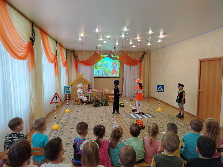 В целях повышения интереса детей к изучению Правил дорожного движения воспитанники МОУ «Центра детства Жемчужинка» показали театрализованное представление по мотивам русской народной сказки «Теремок» по Правилам дорожного движения. Лесные звери рассказали о дорожных знаках, об опасностях, которые могут возникнуть на дороге, а также учили малышей переходить проезжую часть дороги.