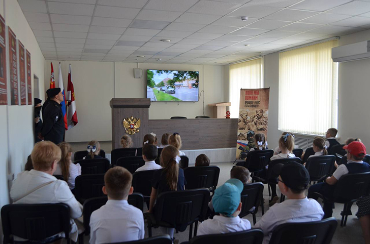 Программа мероприятия началась с просмотра видеоролика об истории образования спецподразделения, его героическим страницам и тренировкам бойцов СОБР. Каждому школьнику были вручены символы воинской славы — «Георгиевские ленточки» и памятные флажки.