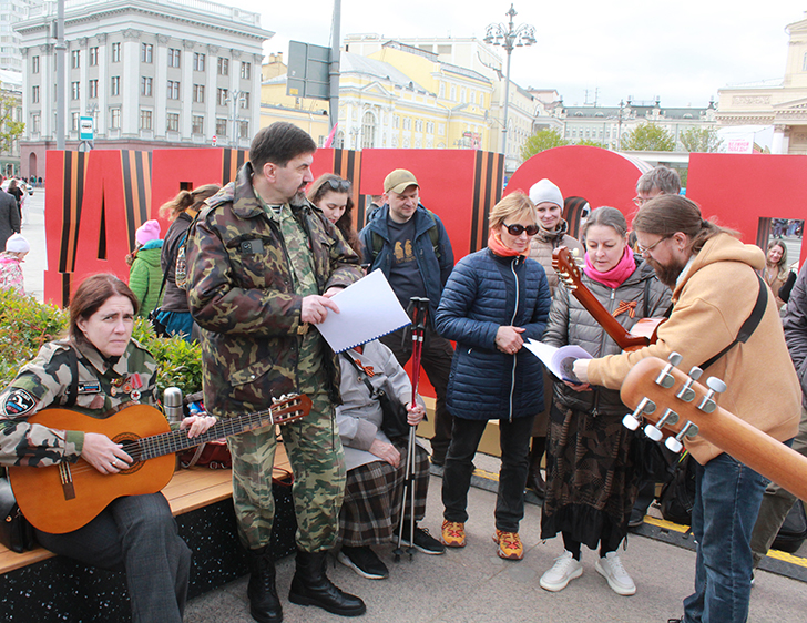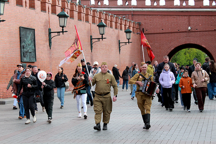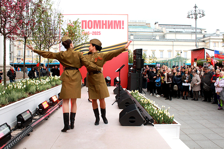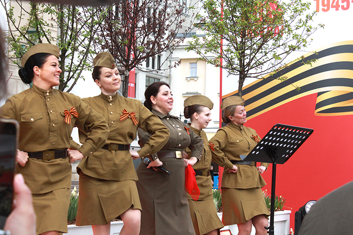 Музыка на каждом углу город превратился в большую сцену. На площадях выступали артисты: от военных оркестров до современных исполнителей. Где-то пели «Катюшу», где-то звучали фронтовые песни, которые когда-то исполнял Марк Бернес, а на Тверской мы вместе с молодежью танцевали под «Рио – риту» и другие ритмы военных лет.