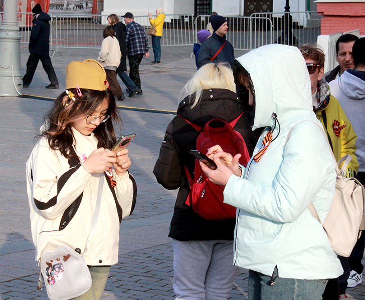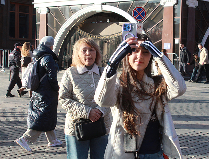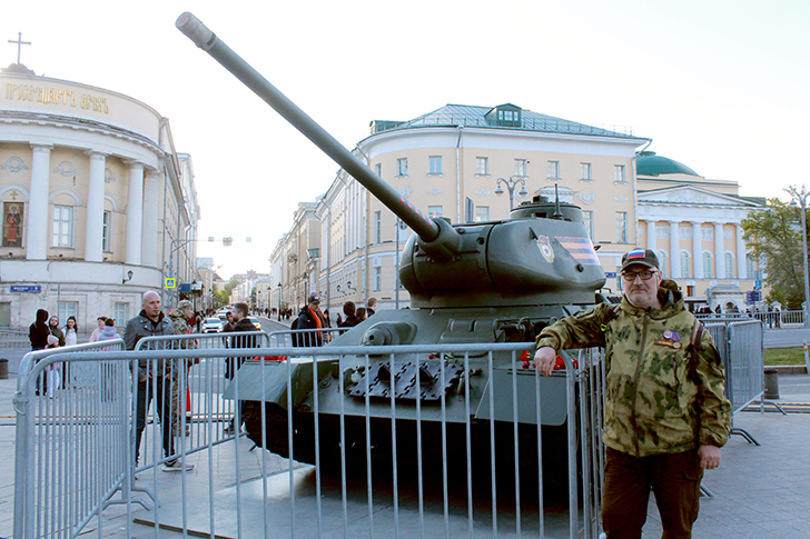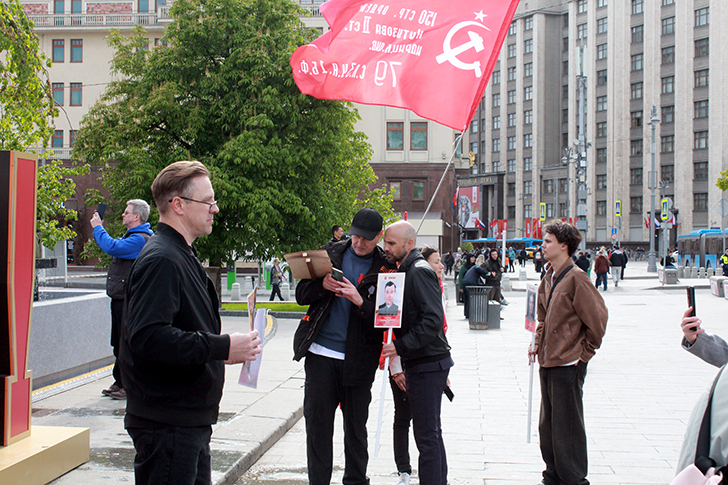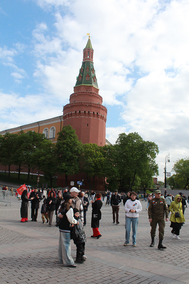 Рядом — реконструкторы в форме времен Великой Отечественной. Кто-то фотографируется с ними, кто-то задает вопросы. И вот уже кажется, что время сместилось: на мгновение 1945-й и 2025-й встречаются здесь, на московской брусчатке.