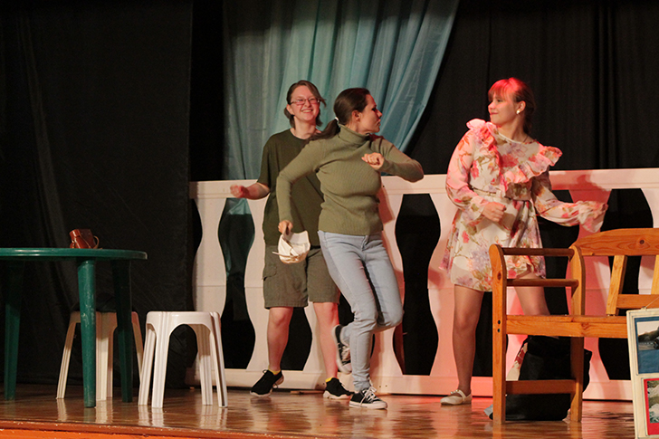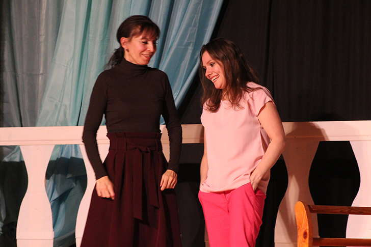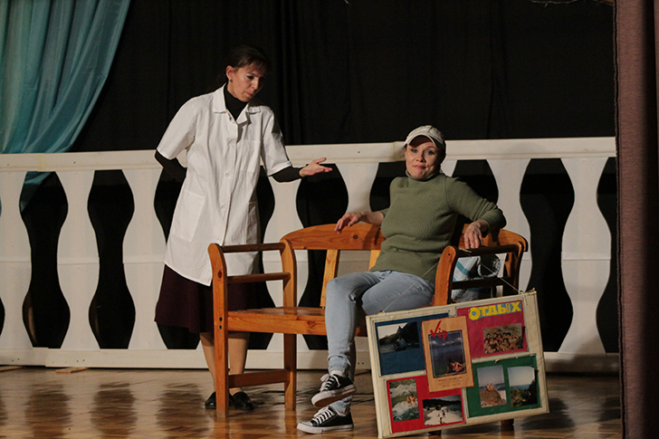 Сцена на глазах зрителя превратилась в ту самую набережную: стол, стулья, скамейка, звуки волн. Минималистичные декорации только подчёркивают эмоциональную насыщенность спектакля. Музыкальное сопровождение — лёгкие джазовые мотивы и шум моря — добавил глубины происходящему.