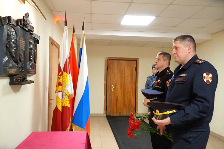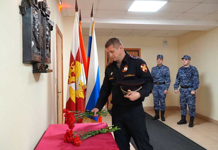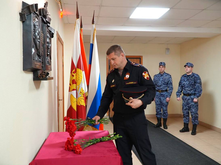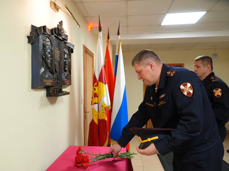 Офицеры возложили цветы к мемориальной табличке, расположенной на территории Главного управления Росгвардии по Московской области, где ежегодно этот день росгвардейцы чтят память погибших товарищей.