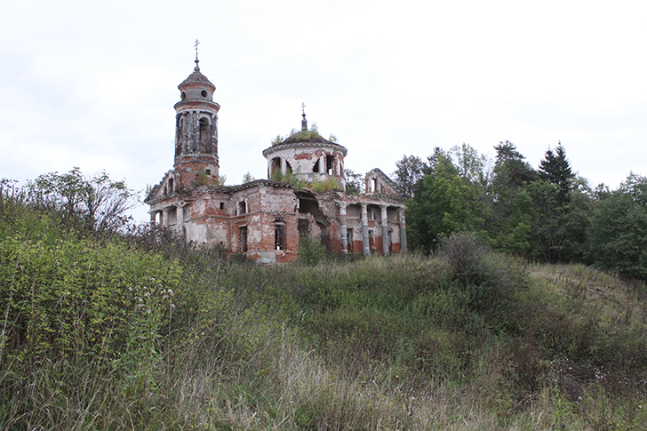 И вот на машине мы ехали дороге с белым гравием достаточно долго и тряско. И вдруг обогнув лесополосу переднами открылся уникальный пейзаж. В зеленой пучине из разнотравья, как бы парил в легкой оражево-кирпичной дымке «Летучий голландец» — это была Знаменская церковь.