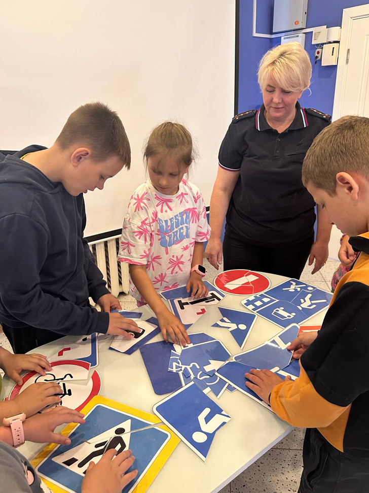 В ходе мероприятия ребята узнали, что дорожные знаки появились, как только человек придумал дороги. Вместе с сотрудником полиции дети вспомнили основные правила безопасного поведения на дороге и дорожные знаки, ответили на вопросы теста «Азбука дорожного движения», собирали пазлы с дорожными знаками и раскрывали их значение.
