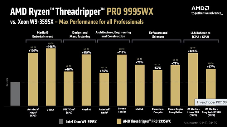 AMD заявляет об увеличении производительности IPC на 16% у Shimada Peak по сравнению со Storm Peak в рабочих нагрузках уровня рабочей станции. Особый акцент делается на тестах искусственного интеллекта и машинного обучения SPECworkstation 4.0, где прирост достигает 25%. Согласно графикам AMD, Threadripper Pro 9995WX показывает производительность до 26% выше, чем Threadripper Pro 7995WX.