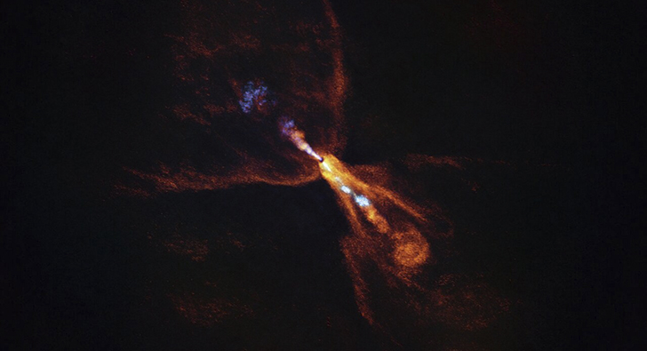 На изображении показаны струи оксида кремния (SiO), вырывающиеся из окрестностей молодой звезды HOPS-315. Синие участки обозначают поток, направленный к нам, красные – от нас. Снимок получен с помощью ALMA. Быстрые струи SiO движутся со скоростью до 100 км/с, тогда как более медленный газ, зафиксированный телескопом «James Webb», перемещается примерно в 10 раз медленнее и находится вблизи звезды – в области размером с пояс астероидов. Низкое содержание газа SiO в струях указывает на то, что часть его уже начала конденсироваться в твердые частицы – первые строительные блоки будущих планет. Credit: ALMA(ESO/NAOJ/NRAO)/M. McClure et al.