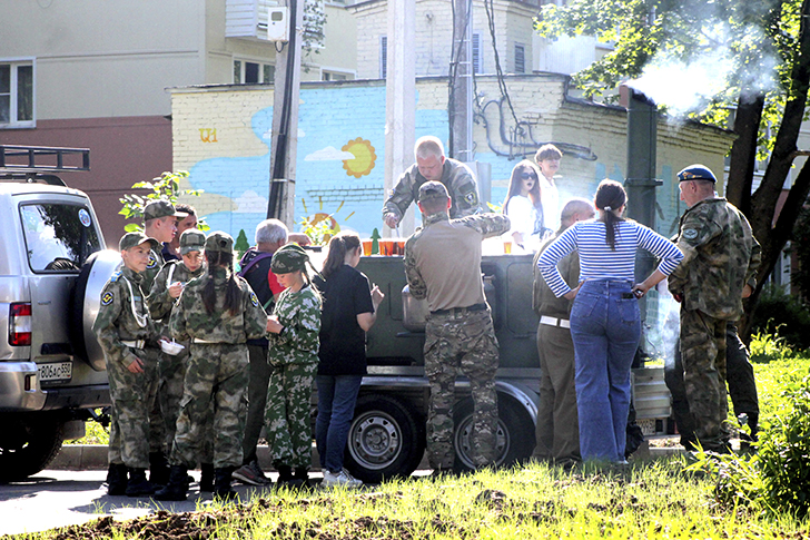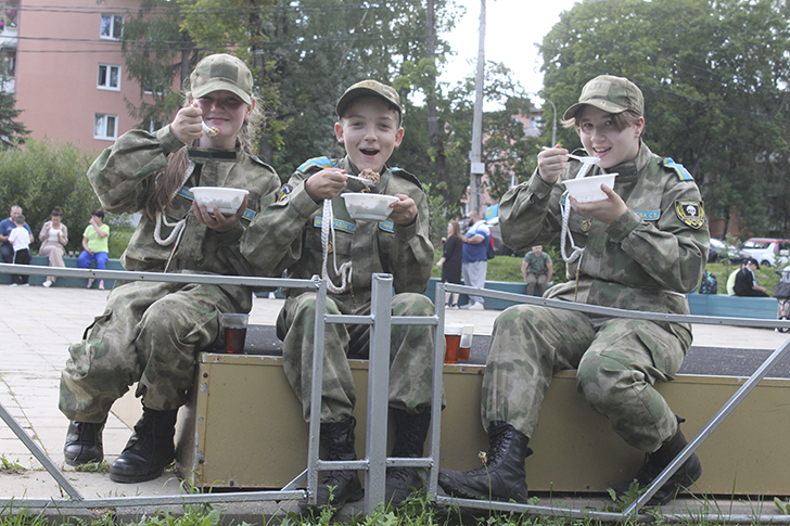 После различных спортивных мероприятий, всех желающих ждала вкусная гречневая каша с тушенкой, горячий сладкий чай из полевой, военной кухни.