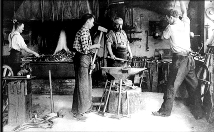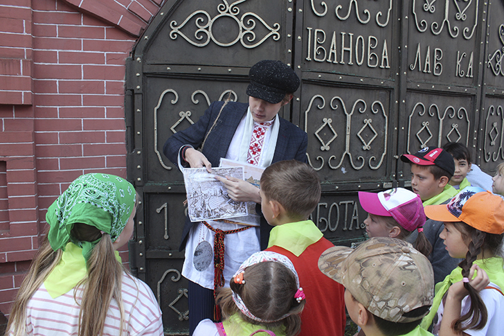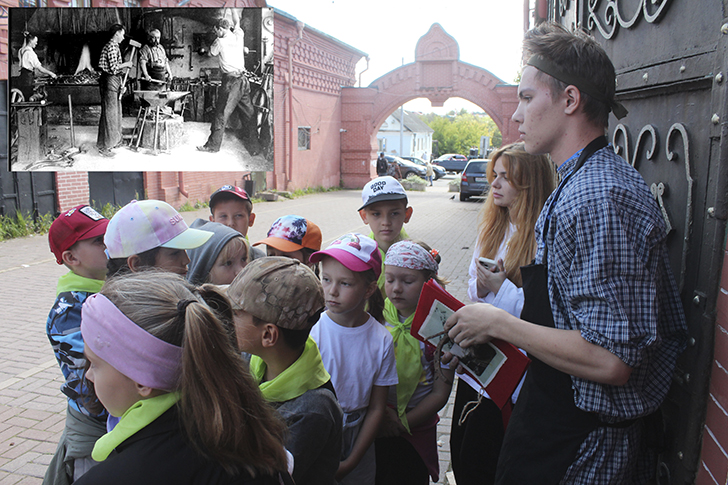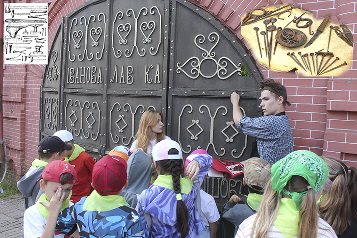 У кованных ворот Ивановой лавки, где работал Тимофей Челышев, нас встретил со своим рассказом мастер кузнец. Он поведал, каким инструментом он работает, какую продукцию может сделать кузнец. Также провел детскую викторину на сообразительность по конским подковам.