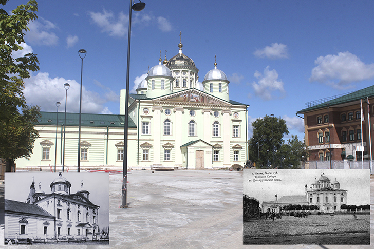 Но своим взглядом я увидел, что Соборная площадь в настоящее время утратила свой статус и наверное обретёт, как только оживет от реставрации Троицкий собор. А вот Долгоруковскую площадь (ныне Советскую) когда-то ограничивали пожарная казарма и торговые ряды. Но новозастроенное здание забрало треть широкой площади и теперь она выглядит зауженной и в неё будто втиснули Троицкий собор.