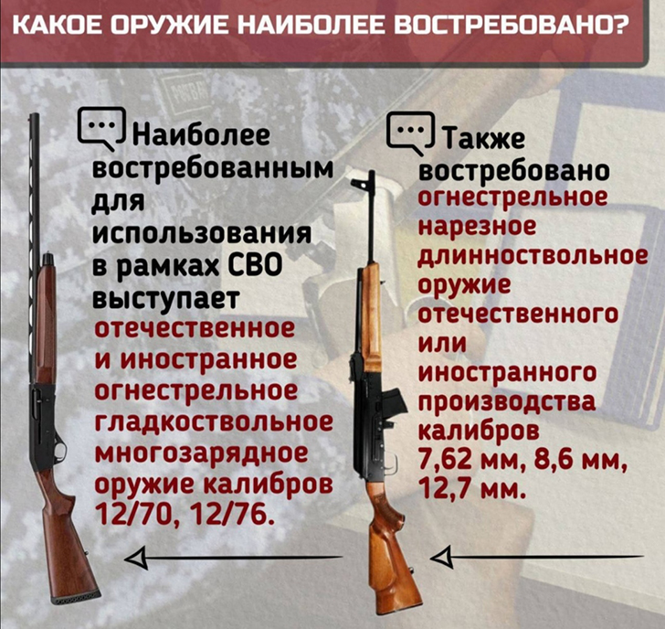 Наиболее востребованным в зоне СВО является отечественное и иностранное огнестрельное гладкоствольное многозарядное оружие калибров 12/70, 12/76, а также огнестрельное нарезное длинноствольное (карабины, винтовки) отечественного или иностранного производства калибров 7,62 мм, 8,6 мм, 12,7 мм.