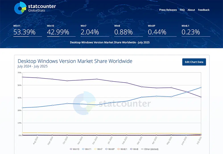 В июле 2025 года рыночная доля Windows 10 сократилась, в то время как доля Windows 11, наоборот, выросла, превысив отметку в 53%. За последний год изменение стало еще более существенным: Windows 11 значительно укрепила свои позиции за счет снижения популярности своей предшественницы.