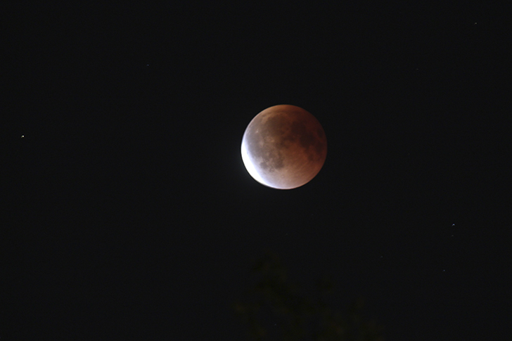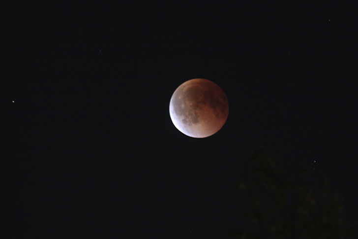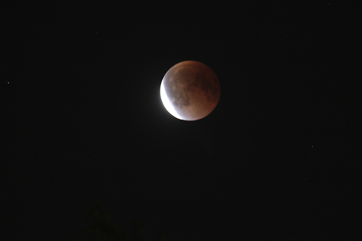 В начале затмения Луна була очень низко, поэтому деревья мешали обзору. Затмение прекрасно было видно невооруженным глазом. Именно четырех сотый ЗУМ объектив помог лучше рассмотреть детали поверхности в красном свете.