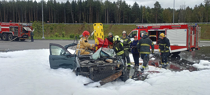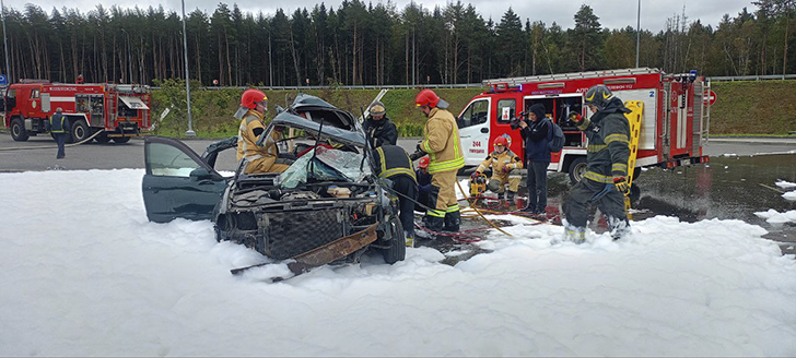 «Согласно легенде, водитель автомобиля не справился с управлением, допустил съезд с дороги и совершил столкновение с дорожным ограждением, в результате чего в моторном отсеке автомобиля произошло условное возгорание. При столкновении мужчину, управлявшего транспортным средством, зажало в салоне искореженными конструкциями, пассажирка автомобиля смогла самостоятельно покинуть машину», – рассказал замначальника части.