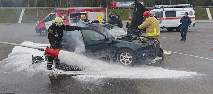 Оказав ему первую помощь, спасатели передали условного пострадавшего бригаде прибывших медиков. Одновременно с этим огнеборцы подали ствол ГПС-600 и ликвидировали условное возгорание моторного отсека. Цели и задачи учений были успешно выполнены.