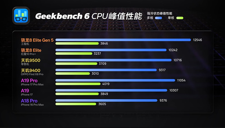 Snapdragon 8 Elite Gen 5 демонстрирует более высокое потребление энергии по сравнению с такими решениями, как A19 Pro: мощность тестового образца достигает почти 19,5 Вт в Geekbench 6.