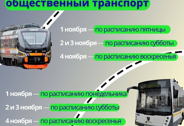Пригородные электропоезда ЦППК в эти дни также будут ездить по специальному графику: 1 ноября — по расписанию пятницы, 2 и 3 ноября — по расписанию субботы, 4 ноября — по расписанию воскресенья, а 5 ноября — по расписанию понедельника.