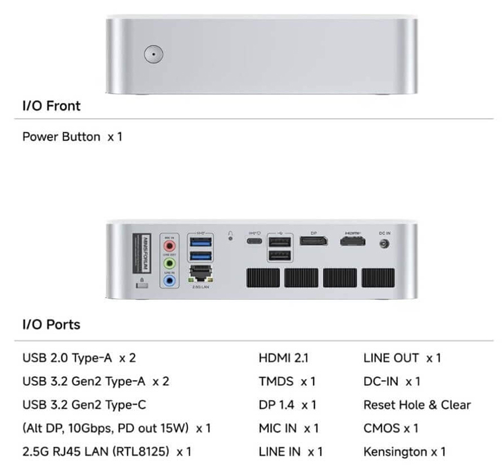 Кроме того, мини-ПК поддерживает Wi-Fi 6E и Bluetooth 5.2. По периметру корпуса расположены два порта USB-A 3.2, полнофункциональный порт USB-C 3.2, два порта USB-A 2.0, три аудиоразъёма и высокоскоростной сетевой порт RJ45 2.5 ГБит/с.