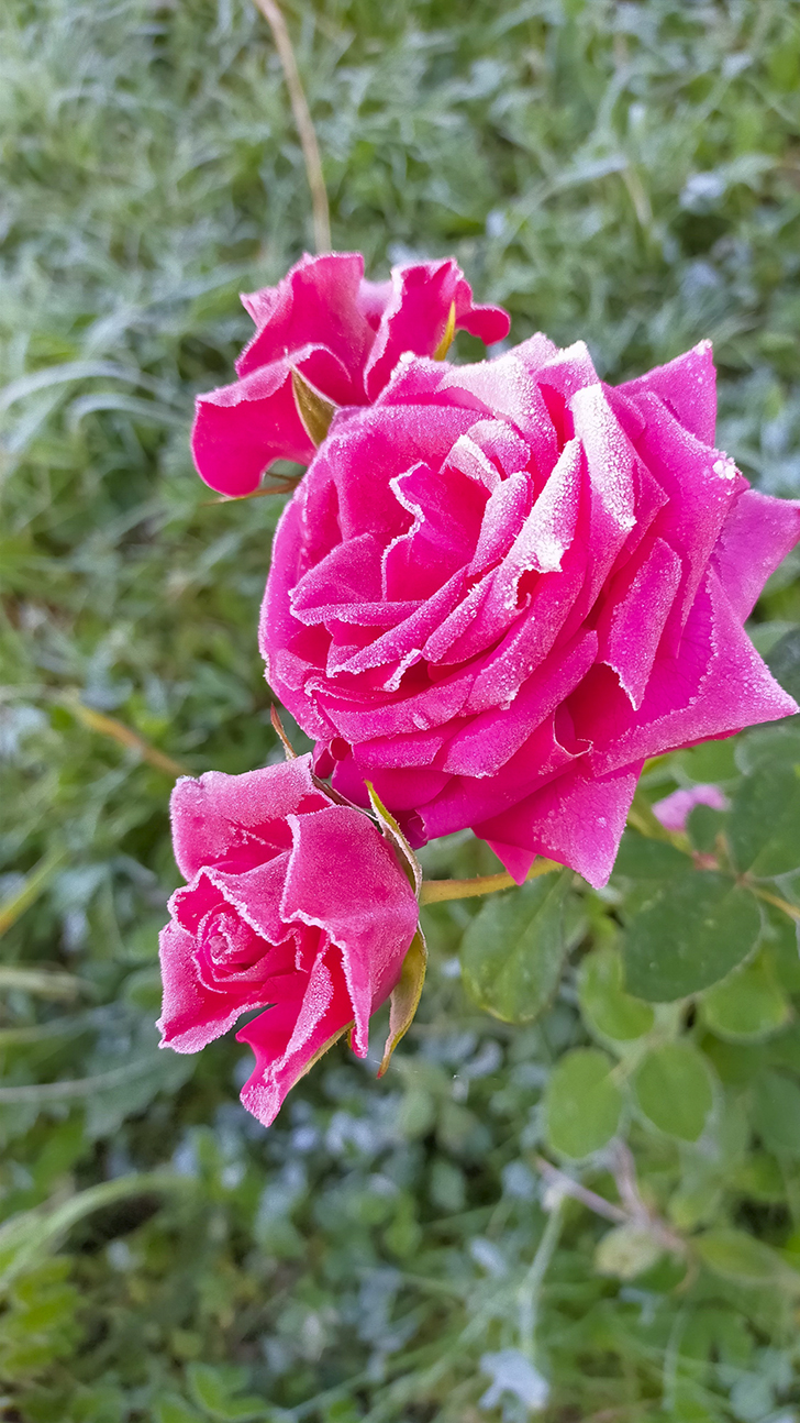 И даже лёгкое дыхание утреннего мороза, оставившее на траве серебристый иней, не в силах испортить эту хрупкую красоту. Напротив, он лишь подчёркивает её, добавляя волшебства. Каждая капля влаги на лепестке превращается в алмаз, а сам цветок, тронутый холодом, кажется еще более стойким и драгоценным.
