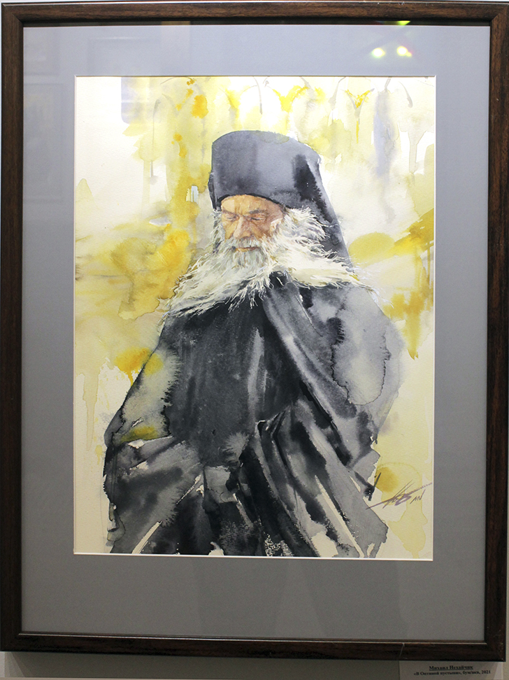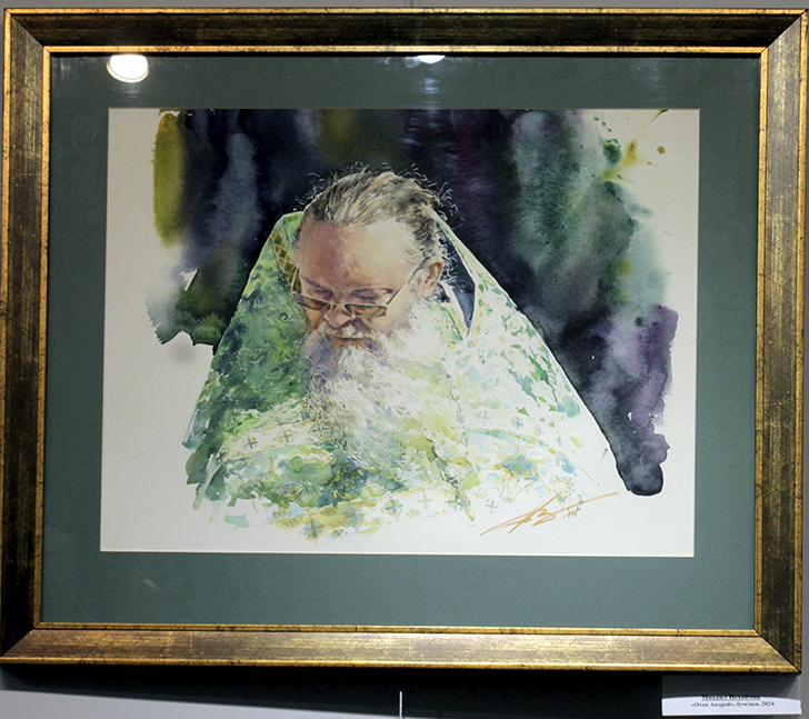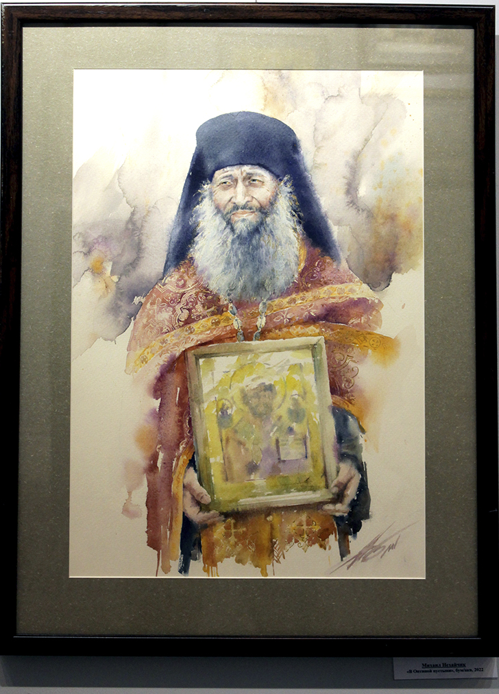 Портреты необычные: это остановленные мгновения церковной службы, где священник, того и гляди, оживет, выйдет из рамы и продолжит свою службу. Все работы светлые, дышащие воздухом, той прекрасной, узнаваемой и постепенно уходящей Руси с её ликами и неповторимыми пейзажами.