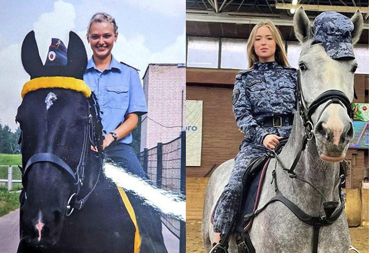 На фото — сотрудница вневедомственной охраны, 2005 год и тренировка по конному спорту сотрудницы Клинского отдела вневедомственной охраны в наши дни.